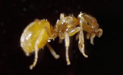 **通体黄色**是最醒目的特征;体型极小;体壁薄而半透明;工蚁形态单一(无明显多态性)