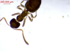 **极小的体型**——工蚁仅约1mm,是世界最小蚂蚁之一;需要放大镜或显微镜才能看清细节;外观呈淡黄色半透明状